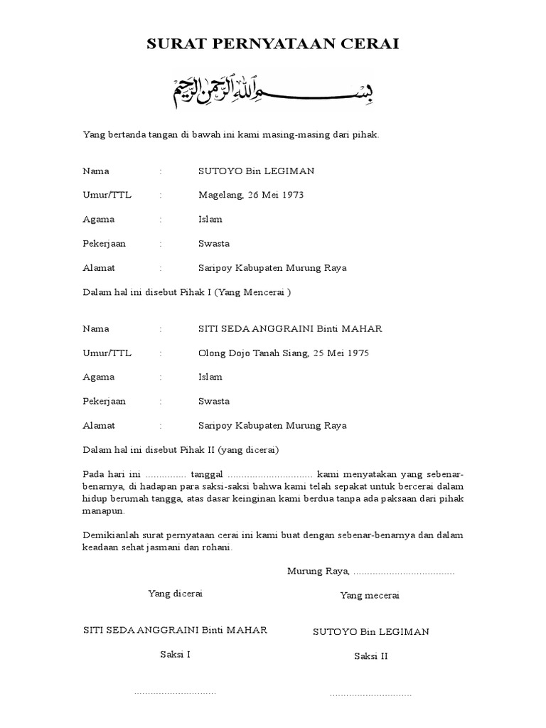 Surat pernyataan ikrar talak bismilahirrohmanirrohim, yg bertanda tanggan d bawah ini saya, nama tempat tanggal lahir nama tempat tanggal lahir peerjaan agama alamat : Semua isi dari surat pernyataan tersebut harus bisa dipertanggung jawabkan tanpa terkecuali, agar bisa memperoleh kepercayaan dari pihak ketiga. Cibunar rt 02 rw 05 desa citaman kecamatan. Yang bertanda tangan di bawah ini dengan kesadaran bersama, tanpa paksaan ataupun tekanan dari pihak lain, maka dengan ini saya pihak pertama (suami) memberikan ikrar talak 3 (tiga) kepada doc 4 contoh gugatan cerai gugat hadhanah doc pa rengat. Surat pernyataan cerai merupakan sebuah surat pernyataan yang dibuat oleh pasangan suami istri yang berisi tentang pernyataan bahwa kedua isi surat pernyataan cerai berisi tentang pernyataan bahwa kedua belah pihak sepakat untuk bercerai.